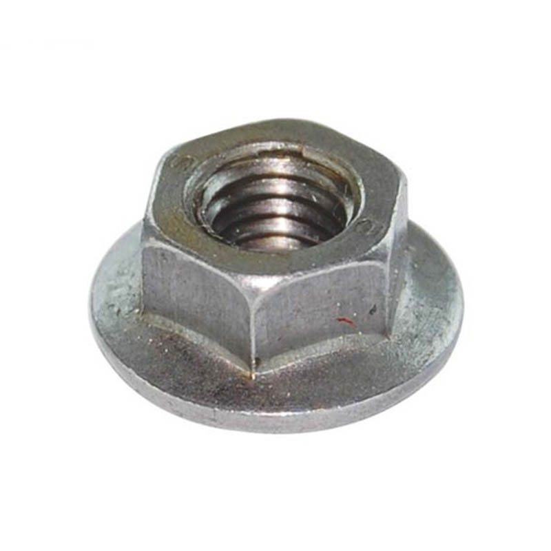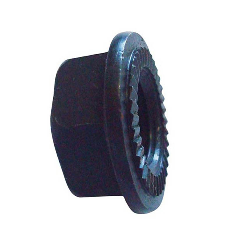 | Средњи угљенични челик | Ове шестоугаоне матице за закључавање са назубљеном прирубницом могу се користити на компонентама аутомобилског вешања или кукама за приколице. Челик који се користи за њих је прошао термичку обраду, тако да се назубљена структура може чврсто закачити без лома. Могу да издрже вибрације током вожње аутопутем или тешка оптерећења без попуштања. Обично су премазани дебљим слојем цинка. |